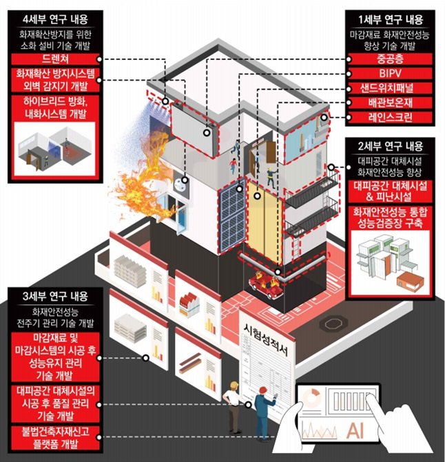 국토부와 소방청이 참여하는 이번 사업은 한국건설기술연구원이 주관 연구기관이다. 화재 확산 방지 기술개발 및 2029년 통합 성능 검증 시설 실증 운영을 목표로 추진한다. 사업비는 국토부 185억원, 소방청 45억원 등 공공에서 230억원, 민간에서 9억원이 투입된다.