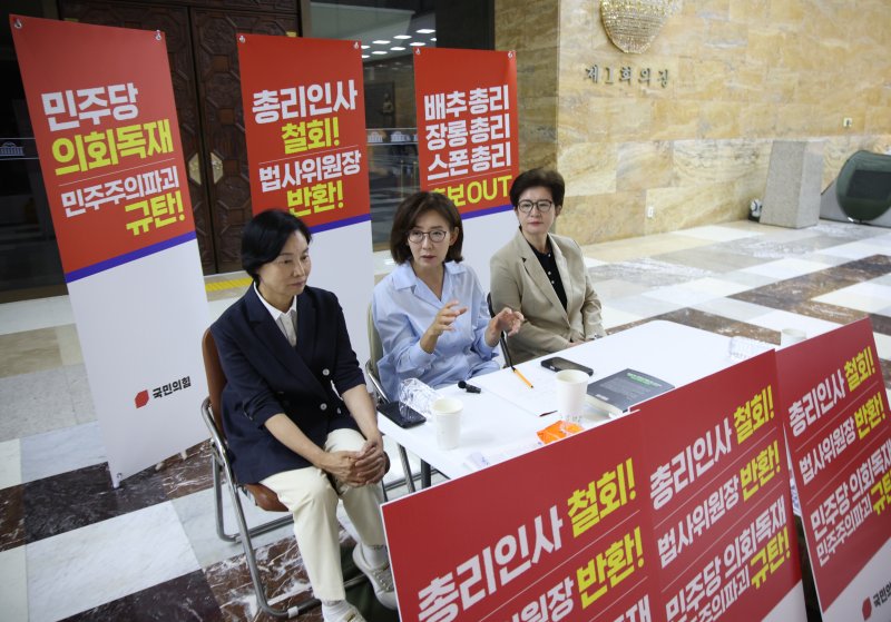 김현정 민주당 원내대변인은 이날 브리핑에서 나경원 국민의힘 의원 등이 국회 로텐더홀에서 농성을 벌이며 국회 법제사법위원장 양보와 김 후보자 사퇴를 촉구하는 데 대해 “총리 후보자 인사청문경과보고서 채택을 거부하고 국회 일정을 마비시키는 행태는 내란을 비호하고 대선 결과를 부정하는 것과 다름없다”고 비판했다.