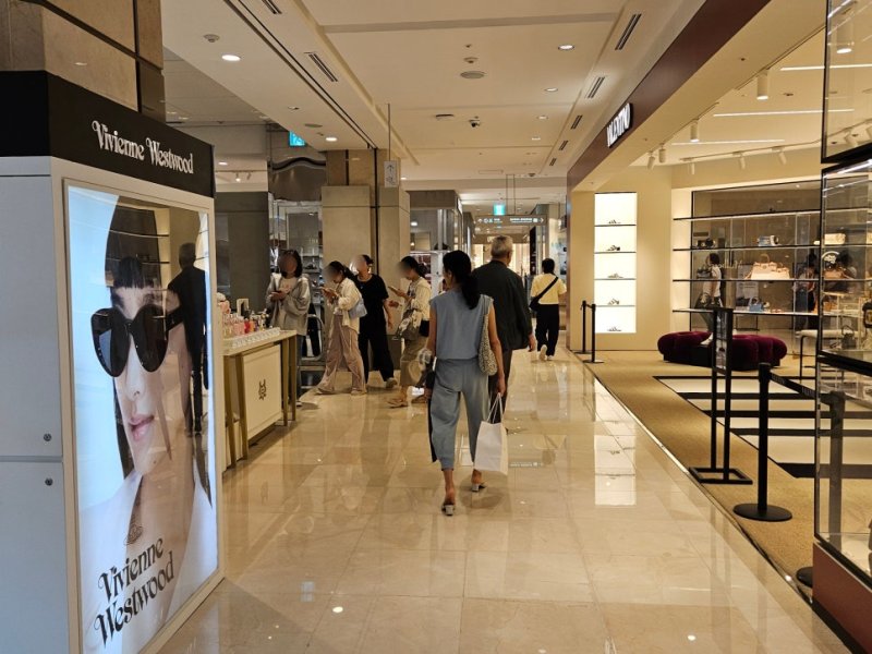여성 패션이 집결한 3층에 자리 잡은 한 커피 매장도 테이블과 바 좌석은 물론, 커피를 판매하는 매장 공간 전체가 고객들로 붐볐다. 중국인 직원을 따로 둘 정도로 중국인 고객 비중이 높은 랄프로렌 매장은 마치 중국에 온 듯 중국어 대화 소리로 가득했다. '30% 할인' 팻말이 적힌 의류 매장 안에는 옷을 거울 앞에서 대보고 가격표를 살피는 고객들로 북적였다.