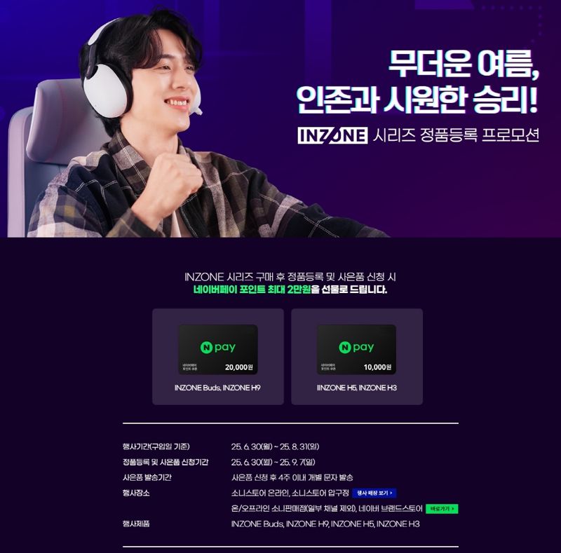 프로모션 기간 중 인존 시리즈 제품을 구입하고 9월 7일까지 소니코리아 고객지원 사이트에서 정품 등록 후 사은품 신청까지 완료하면 네이버페이 포인트를 받을 수 있다. 인존 버즈 및 인존 H9 구매 시 네이버페이 포인트 2만원을, 인존 H5 및 인존 H3 구매 시 네이버페이 포인트 1만원을 제공한다.