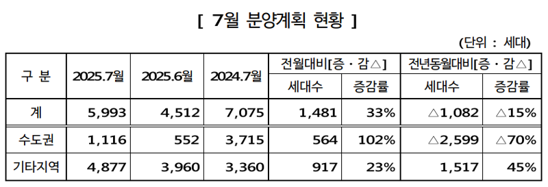 이는 전월(4512가구) 대비 33%(1481가구) 증가한 수치이나, 전년 동월(7075가구) 대비 15%(1082가구) 감소한 수치다.