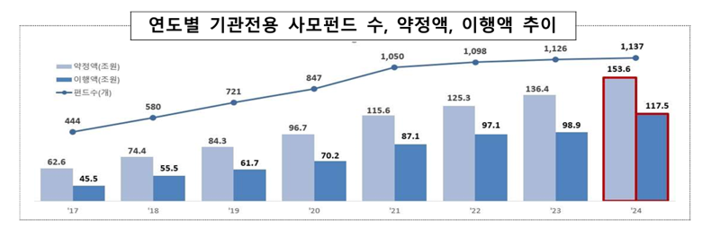 30일 금융감독원이 발표한 '2025년 기관전용 사모펀드 운용현황 및 시사점' 자료에 따르면 작년 말 기준 기관전용 사모펀드는 1137개개로 전년 말 대비 11개(1.0%) 증가했다. 출자 약정액은 153조6000억원, 이행액은 117조5000억원으로 각각 17조2000억원(12.6%), 18조6000억원(18.8%) 증가했다. 기관 전용 사모펀드 규모는 매년 증가세를 이어가며 사상 최대 규모 기록을 경신하고 있다. 다만 작년 기관전용 사모펀드의 투자집행 규모는 24조1000억원으로 전년 대비 8조4000원(25.8%) 감소했다.