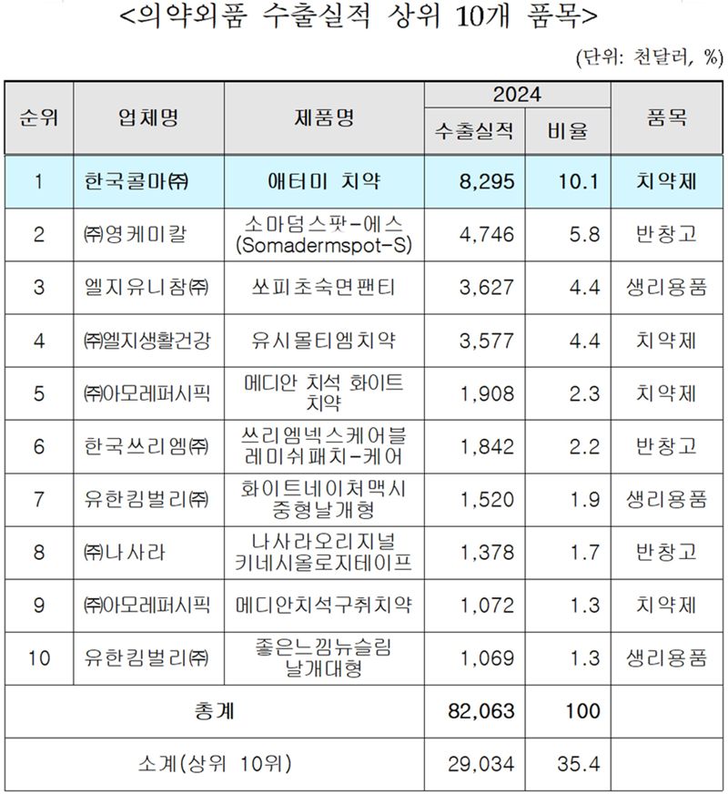 식품의약품안전처가 최근 공개한 의약외품 수출 실적에 따르면 애터미 치약은 2024년도에 829만5000 달러(약 113억 원)의 수출을 기록, 의약외품 가운데 가장 많은 수출액을 기록했다. 2위에는 474만6천 달러(약 65억 원)의 수출을 기록한 영케미칼의 반창고 가, 3위에는 362만7000 달러(약 50억 원)의 수출고를 올린 엘지유니참의 ‘쏘피초숙면팬티’가 차지했다.