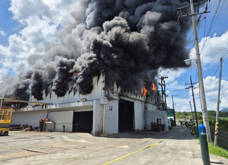 (영천=뉴스1) 신성훈 기자 = 30일 오후 1시 19분쯤 경북 영천시 신녕면 완전리 한 폐기물 공장에서 원인을 알 수 없는 불이 났다.