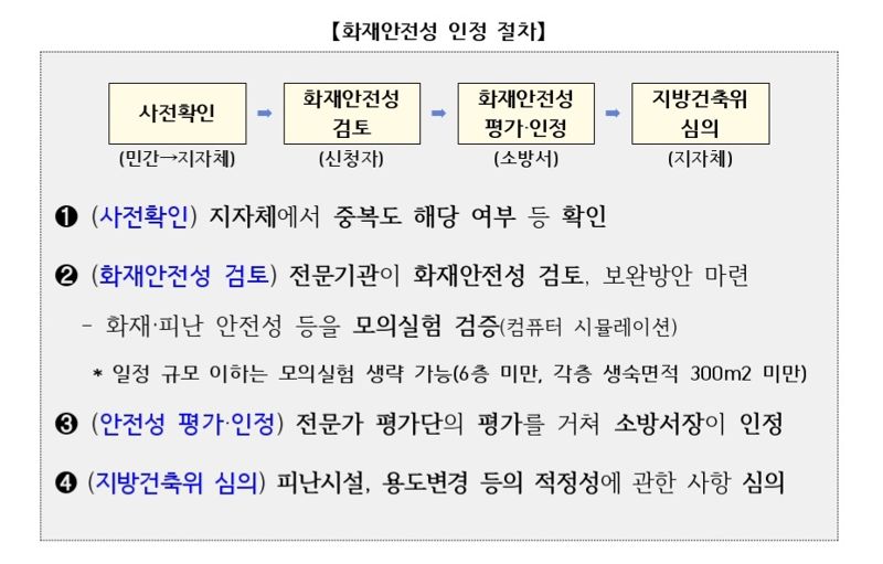 아울러 관할 소방서장의 화재안전성 인정을 받은 경우, 신청자는 검토 결과서를 첨부해 관할 지자체의 지방건축위원회 심의를 신청해야 한다. 위원회는 화재안전성에 대한 검토를 포함해 용도변경의 적정성에 대해 심의하고 의결한다.