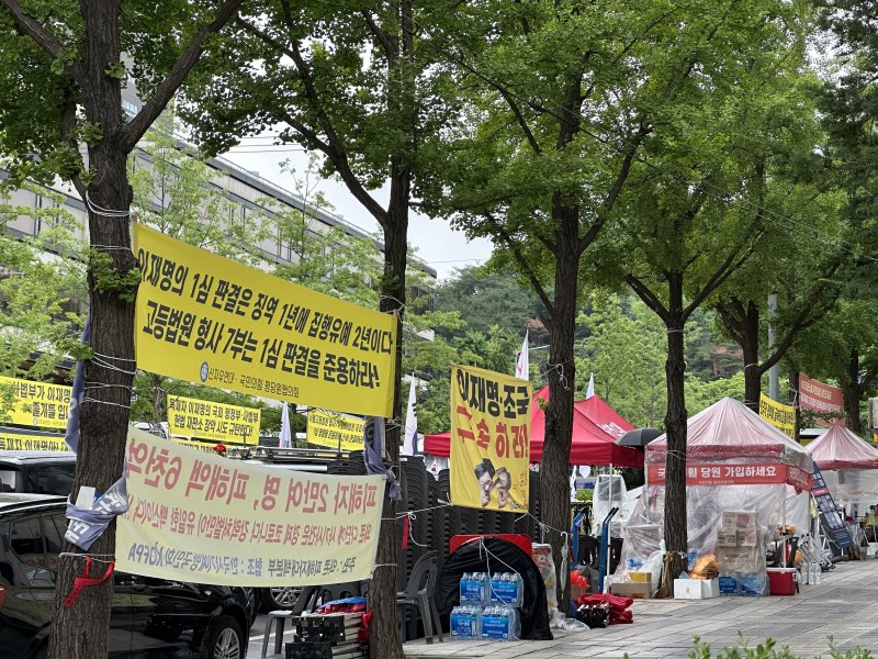 신자유연대는 '독재자 이재명의 국회 행정부·사법부 헌법재판소 장악 시도 규탄한다', '이재명 민주당 협박에 굴복하고 쫄아버린 고등법원 형사 7부 판사들 국민이 영원히 기억한다' 등의 문구가 적힌 현수막을 내걸었다.