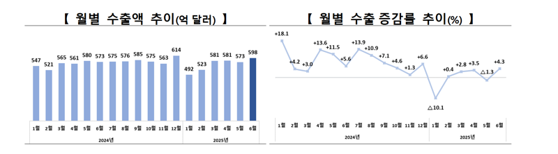 [파이낸셜뉴스] 트럼프발 관세 리스크에도 6월 수출은 전년 동월 대비 4.3% 증가한 598억달러를 기록했다. 역대 6월 중 최대 수치다. 대미·대중 수출은 둔화됐지만 대아세안, 유럽연합(EU)을 비롯한 타 국가로의 수출이 늘며 선방한 결과다.