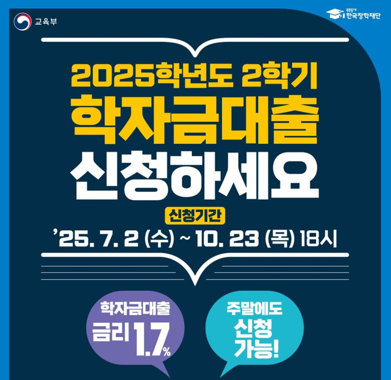 교육부와 한국장학재단은 2일부터 2025학년도 2학기 학자금 대출 신청·접수를 받는다. 등록금 대출은 10월 23일까지, 생활비 대출은 11월 18일까지다.