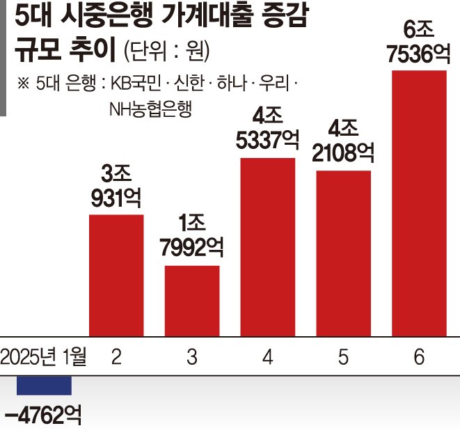 6·27 대책과 7월 1일부터 도입된 스트레스 총부채원리금상환비율(DSR) 3단계 막차 수요가 겹치면서 지난달 5대 시중은행의 가계대출이 7조원 가까이 폭증했다.