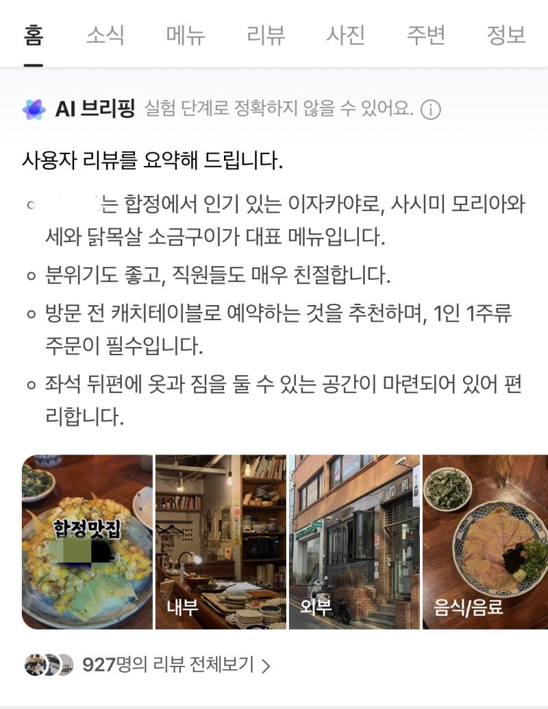 1일 네이버에 따르면 지난달 12일부터 식당 및 카페의 주요 특징을 한 눈에 파악할 수 있는 플레이스형 AI 브리핑이 도입돼 점차 적용 장소가 늘어나고 있다. 네이버 애플리케이션(앱)이나 지도앱을 통해 특정 장소를 검색하면, AI가 분류한 사진 정보와 리뷰를 기반으로 △ 대표 메뉴△ 장소 분위기 △ 유의사항·예약 여부 △ 특이사항 등 다양한 정보를 제공해준다. 예를 들어 서울 합정에 있는 한 일본식 술집을 검색하면 AI 브리핑이 "합정에서 인기 있는 이자카야로, 모듬회와 닭목살 소금구이가 대표 메뉴"라며 "분위기도 좋고 직원들도 친절하다"고 정리해준다. 또 "캐치테이블로 예약을 추천하며, 1인 1주류 주문이 필수"라며 "좌석 뒤편에 옷과 짐을 둘 수 있는 공간이 마련됐다"고 구체적인 유의사항도 제공한다.