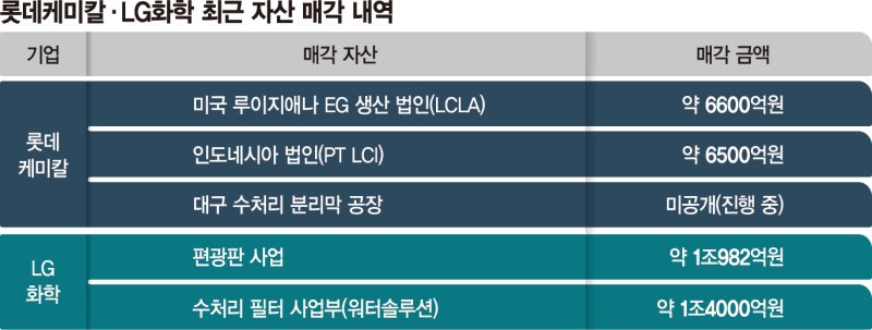 실제 롯데케미칼은 석화 업황 부진에 대응해 약 1조7000억원 규모의 현금 확보에 나섰다. 지난해부터 올해 상반기까지 미국 루이지애나 에틸렌글리콜(EG) 생산법인(LCLA) 지분 40%를 약 6600억원에 매각했고, 인도네시아 법인(PT LCI) 지분 25%도 약 6500억원에 처분했다. 이 외에도 대구 국가물산업클러스터 내 연면적 5775㎡ 규모의 수처리 분리막 공장도 시노펙스멤브레인에 매각하는 절차를 진행 중이다.