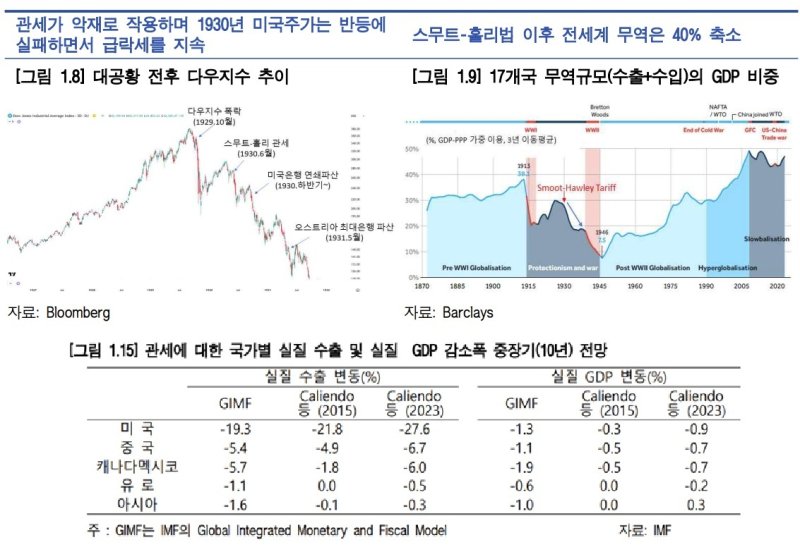 사무소는 또한 역사적 유사 사례로 1930년대 '스무트-홀리법'을 소개했다. 당시에도 미국은 자국 산업 보호를 명분으로 고율 관세를 도입했고, 주요 교역국은 보복에 나서며 세계 무역이 급감했다. 미국 경제는 1930~1932년 수출이 66.7%나 감소할 정도로 심각한 침체를 겪었다.