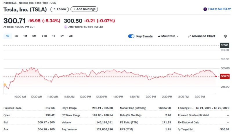 이같은 설전으로 이날 테슬라 주가는 5% 이상 급락했다. 테슬라는 뉴욕증시에서 5.34% 급락한 300.71달러를 기록했다.