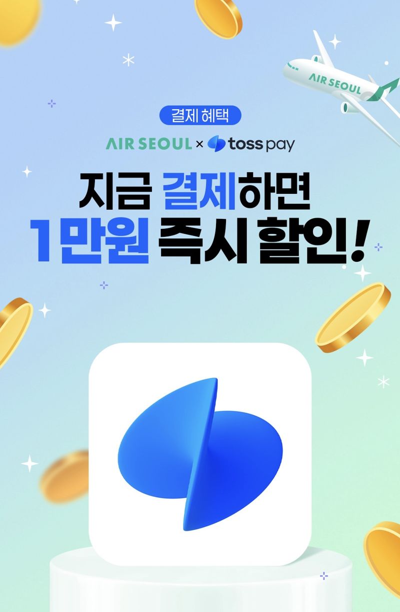 에어서울에서 토스페이로 첫 결제 및 30만원 이상 결제하는 고객은, 1만원 즉시 할인 혜택을 받을 수 있다. 국내선 및 국제선 전 노선에 사용할 수 있으며 복잡한 절차 없이 결제 단계에서 바로 할인을 받을 수 있다.