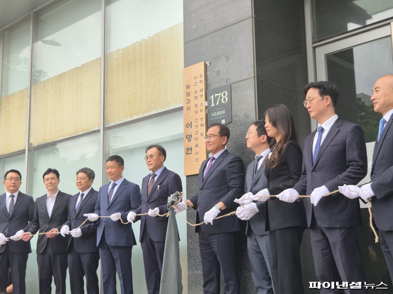 '순직 해병 수사 방해 및 사건 은폐 등의 진상규명을 위한 특별검사 이명현'이라고 적힌 현판은 건물 1층 정문 앞에 걸렸고, 이 특검이 덮개를 벗기며 수사의 시작을 알렸다.