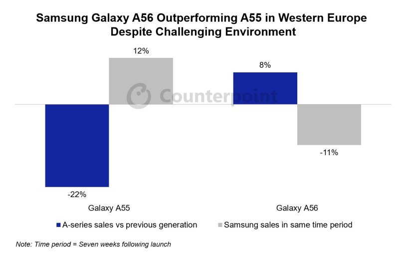 시장조사업체 카운터포인트리서치는 2일 "2025년 3월 19일 출시 이후 서유럽에서 출시된 첫 7주간 갤럭시A56의 판매량은 전작(갤럭시A55) 대비 12% 증가했다"고 발표했다.