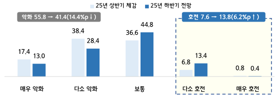 조사에 따르면 올해 하반기 경기전망이 호전될 것이라는 응답 비중은 13.8%로, 상반기(7.6%) 대비 6.2%p 증가했다.