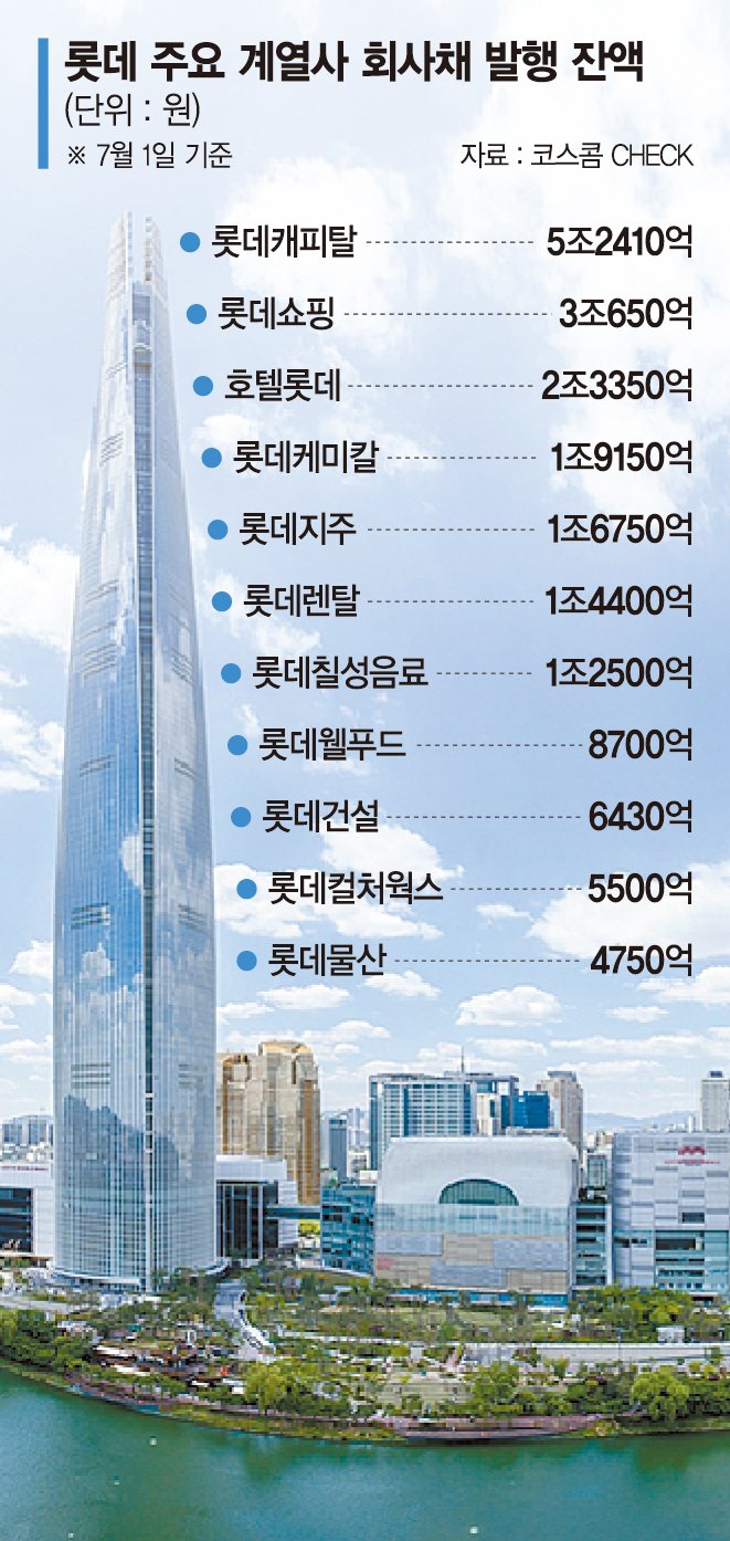 롯데그룹은 21개 계열사에서 회사채를 발행한 상황이다. 회사채 발행 잔액(21조3140억원)에 기업어음(CP) 및 전단채 잔액(4조3539억원)까지 더하면 시장성 차입금은 25조원을 훌쩍 넘어간다.