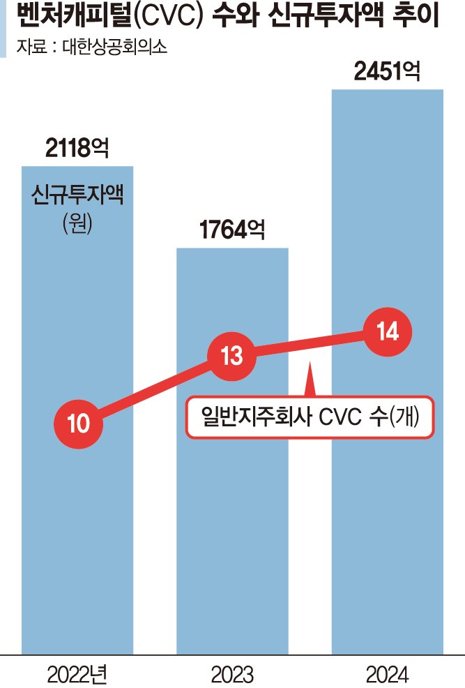 CVC는 모기업의 노하우와 사업 역량을 바탕으로 혁신기업에 자본을 공급하고 동반 성장을 지원할 수 있는 장점이 있지만, 외부출자(펀드결성액의 40%)와 해외투자(총자산의 20%), 부채비율(200%) 등 엄격한 규제로 활성화가 더딘 편이다. 실제로 지난해 14개사가 2451억원을 투자했지만 전체 VC투자(10조9000억원)의 2.2%에 그치는 등 아직 활용도가 높지 않다.