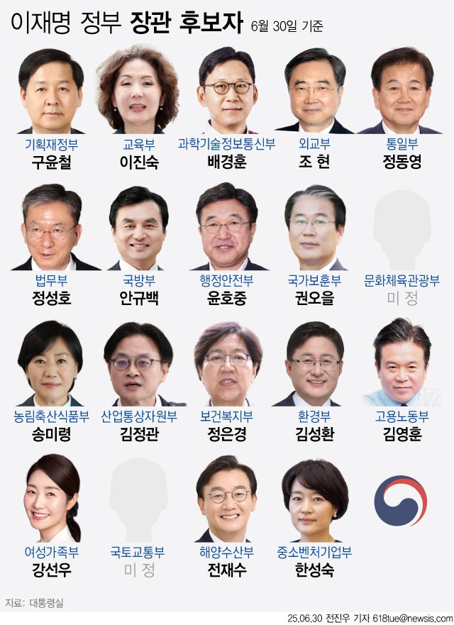 네이버 대표 출신 한성숙 중소벤처기업부 장관 후보자, 두산에너빌리티 사장 출신 김정관 산업부 장관 후보자 등 기업인 출신 발탁도 주목받고 있다.