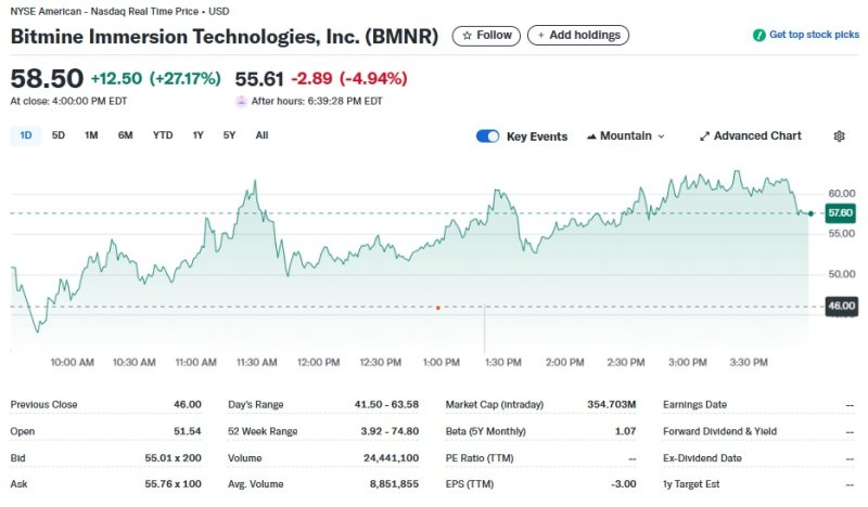 2일(현지시간) 뉴욕증시에서 비트마인은 27.17% 폭등한 58.50달러를 기록했다. 이로써 비트마인은 지난 5거래일 동안 무려 1238% 폭등했다.