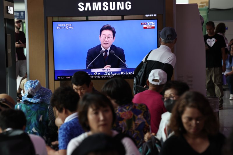 3일 오전 서울역 대합실에서 시민들이 이재명 대통령 ‘취임 한달’ 기자회견 생중계 영상을 시청하고 있다. 2025.7.3/뉴스1 ⓒ News1 구윤성 기자