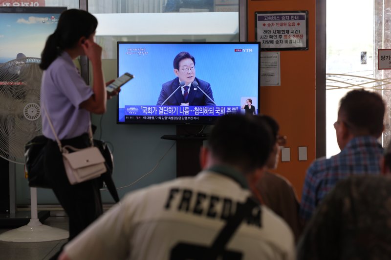 3일 오전 광주 서구 유스퀘어 광주종합버스터미널에서 시민들이 이재명 대통령의 기자회견 생중계를 시청하고 있다. 2025.7.3/뉴스1 ⓒ News1 박지현 기자