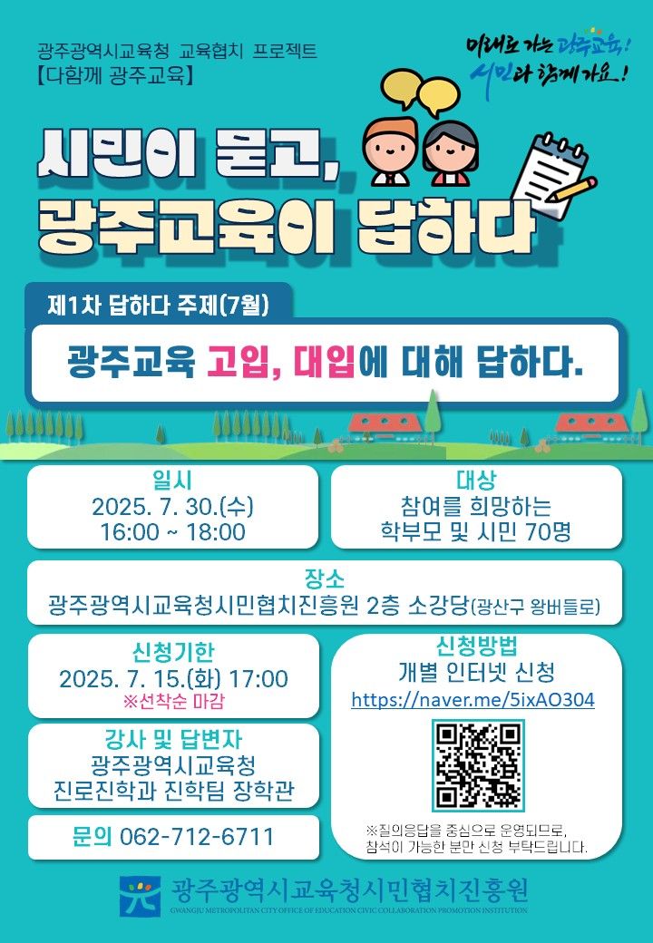 첫 행사는 오는 30일 오후 4시 시민협치진흥원 소강당에서 '광주교육 고입, 대입에 대해 답하다'를 주제로 열린다. 시교육청 진로진학과 진학팀 정훈탁 장학관이 고등학교와 대학교 입학 지원 등 진학 관련 사업을 설명하고, 시민들의 질의응답을 받을 계획이다.
