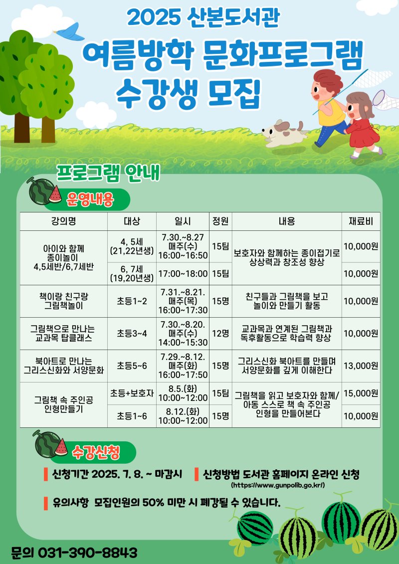 [군포=뉴시스] 박석희 기자 = 경기 군포시 산본도서관은 29일부터 다음 달 27일까지 '2025년 여름방학 독서 진흥 강좌'를 운영하는 가운데 참여자 희망자를 8일부터 모집한다고 3일 밝혔다. 희망자는 도서관 홈페이지를 통해 신청하면 된다.