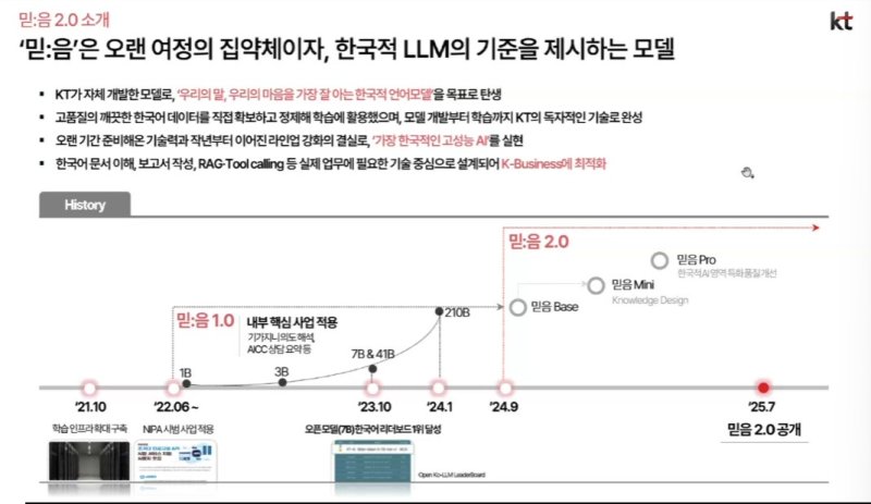 KT는 지난 2023년 믿:음 1.0 버전을 공개한 바 있다. 이번 공개하는 2.0 모델은 115억 파라미터 규모의 '믿:음 2.0 베이스(Base)', 23억 파라미터 규모 '믿:음 2.0 미니(Mini)' 2종으로 한국어와 영어를 지원한다. 추후 프로 모델과 추론형, 멀티모달 모델까지도 순차 출시할 예정이다.