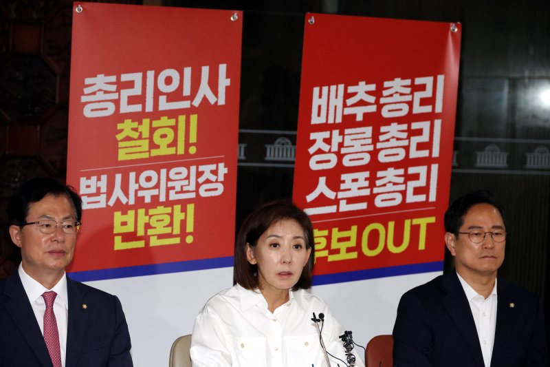 [서울=뉴시스]하다임 인턴 기자 = 김민석 국무총리 후보자 지명 철회 등을 촉구하며 국회 본청에서 농성을 이어온 나경원 국민의힘 의원이 3일 오후 국회 본회의에서 총리 인준안이 통과되면 숙식 농성을 중단하겠다고 밝혔다.