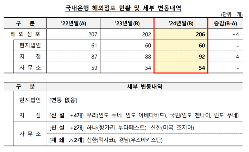 국내은행의 해외점포는 총 206개(41개국)로 전년 말 대비 4개 증가했다.