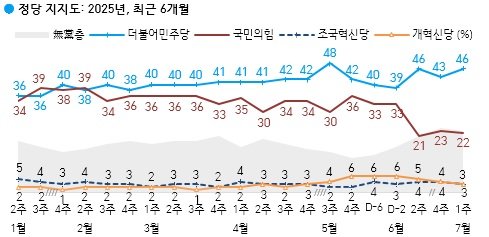 직전 조사(6월 24~26일) 대비 민주당 지지율은 3%포인트(p) 올랐고, 국민의힘 지지율은 1%p 하락했다.
