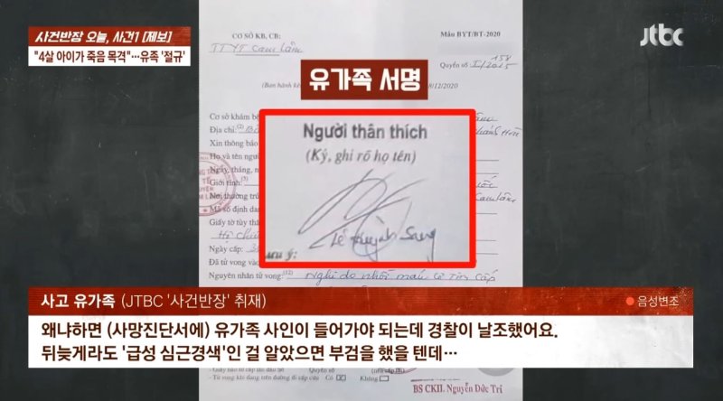 유족은 베트남 현지 공안의 비협조적인 태도도 지적했다. A씨는 "B씨 사인이 당연히 익사인 줄 알고 화장하겠다고 했다. 그런데 사망진단서에는 사인이 급성 심근경색으로 돼 있고, 유가족 서명란에는 현지 공안이 날조한 서명이 들어가 있었다"라며 "사인이 급성 심근경색인 줄 알았으면, 부검했을 것이다. 이러면 공안 측에선 기저 질환 등으로 수사할 게 뻔하다. 책임을 회피하는 것"이라고 분통을 터뜨렸다.