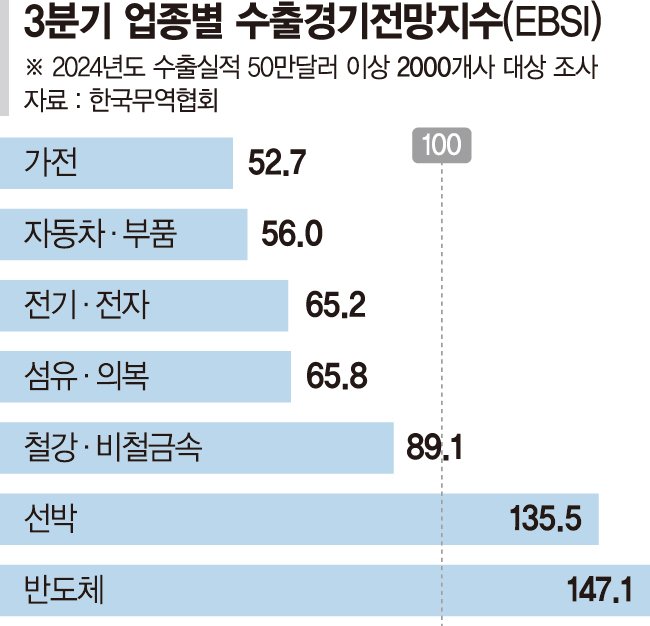 7일 산업계에 따르면 올 하반기 한국의 15개 주력 수출업종 중 반도체와 조선업종 등 5개 업종을 제외한 가전, 자동차, 섬유·의복 등 소비재 산업과 미국 정부가 고율(50%)의 품목별 관세를 부과한 철강 업종 등 10개 업종이 일제히 수출 악화에 시달릴 전망이다. 수출산업경기전망지수(한국무역협회 실시)는 올해 1·4분기부터 3·4분기까지 3분기 연속으로 기준선(100)을 하회한 상태다.