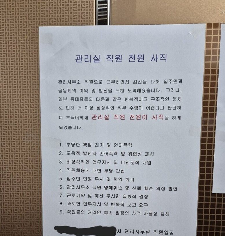 해당 안내문에는 '관리실 직원 전원 사직'이라는 제목과 함께 "관리사무소 직원으로 근무하면서 최선을 다해 입주민과 공동체의 이익 및 발전을 위해 노력해왔습니다. 그러나 일부 동대표들의 다음과 같은 반복적이고 구조적인 문제로 인해 더는 정상적인 직무 수행이 어렵다고 판단해 부득이하게 관리실 직원 전원이 사직을 하게 됐습니다"라고 적혔다.