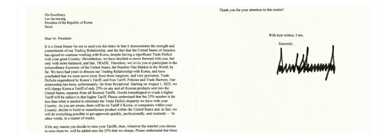 그러면서 "2025년 8월 1일부터 우리는 한국에서 수입되는 모든 제품에 대해 기존의 품목별 관세와는 별도로 25%의 관세를 부과할 예정이다"며 "높은 관세를 피하기 위해 제3국을 경유한 물품 역시 높은 관세 대상이 된다"고 밝혔다.