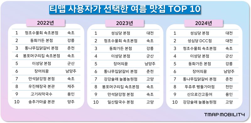 티맵모빌리티는 최근 3년간 여름휴가 기간(7~8월) 주행 데이터를 분석한 결과, 2022년 1곳에 불과했던 제과점 맛집이 2024년에는 4곳으로 늘어났다고 8일 밝혔다.
