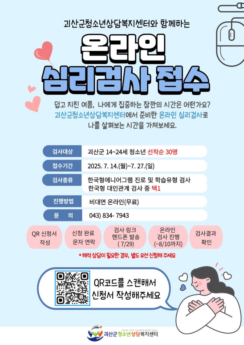 (괴산=뉴스1) 이성기 기자 = 충북 괴산군청소년상담복지센터(센터장 유현)는 여름방학을 맞아 청소년에게 심리 특성 이해와 자기 점검 기회를 제공하기 위해 '2025년 여름방학 온라인 심리검사'를 운영한다고 8일 밝혔다.