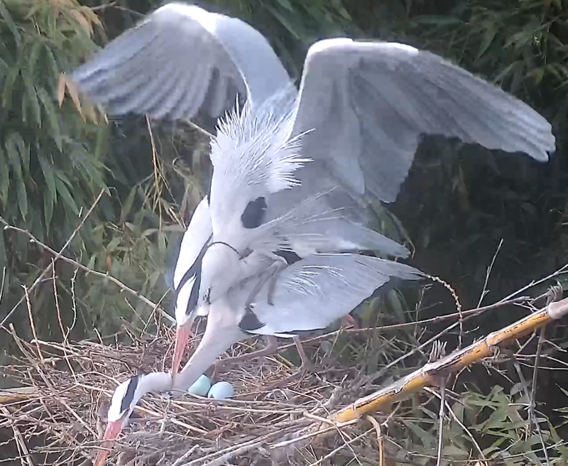 다행히 다음 날인 지난 3월 21일에는 암컷 왜가리가 1개의 알을 낳는 장면이 포착됐으며, 이어 27일 오후 2시 50분경 두 번째 알을 낳는 장면이 관찰됐다. 29일에는 세 번째 알을 낳아 암수가 교대로 알을 품기 시작했다.