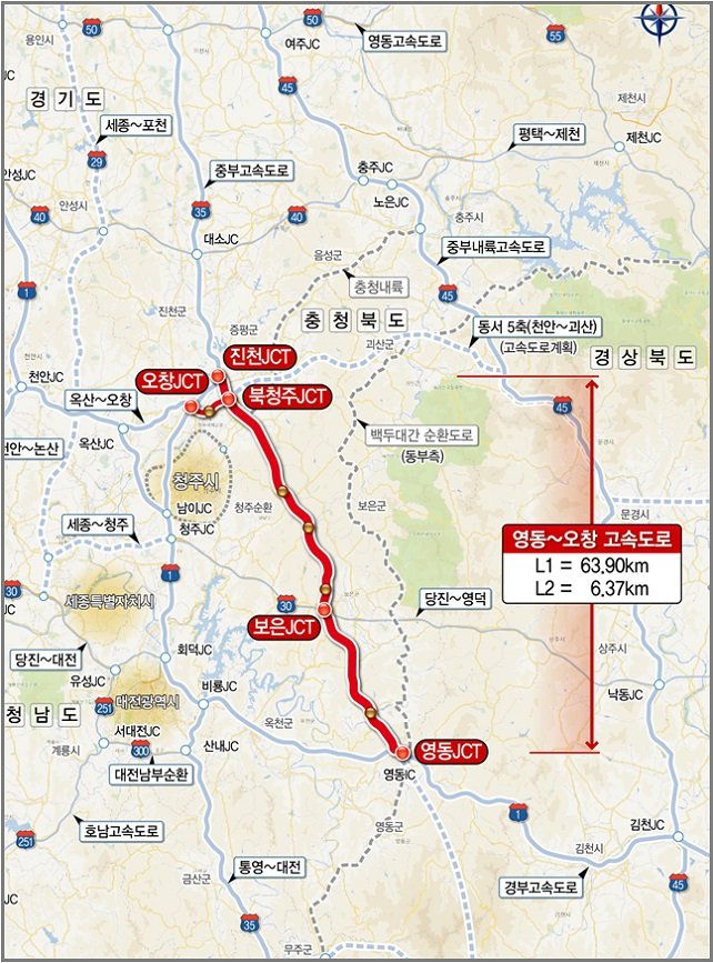 경부고속도로 나들목(영동IC)이 있는 영동군 용산면 한곡리에서 보은군을 관통한 후 청주시 오창읍 오창JCT 구간까지 총연장 70.27㎞, 왕복 4차로를 건설하는 사업이다. 2027년 착공해 2031년 준공하는 게 목표다.