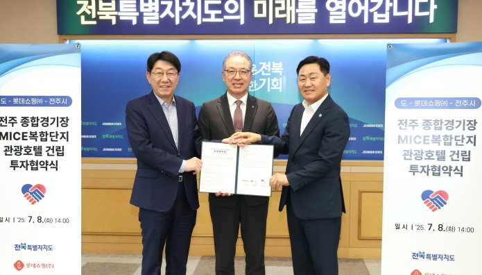 8일 전북도청에서 '전주 종합경기장 MICE 복합단지 관광호텔 건립 투자협약(MOU) 체결식'이 개최됐다. 협약식에는 김관영 전북지사와 우범기 전주시장, 정준호 롯데쇼핑 대표 등이 참석했다.