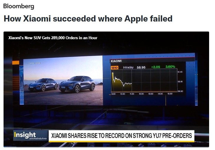 한때 부동의 시총 1위 기업이었던 애플도 실패한 전기차를 샤오미가 성공하자 미국의 빅테크 기업들이 놀라워하고 있다고 블룸버그는 전했다.
