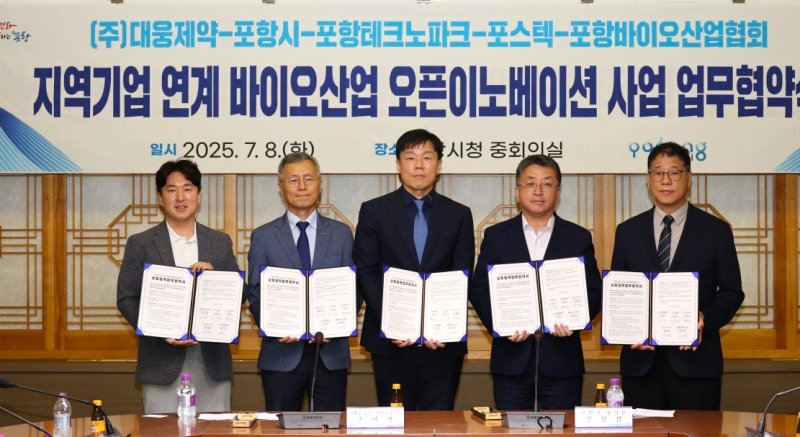 시는 8일 포항테크노파크, 대웅제약㈜, 포스텍 세포막단백질연구소, 포항바이오산업협회와 공동으로 '포항 바이오 오픈이노베이션 활성화를 위한 업무 협약(MOU)'을 체결한 것.