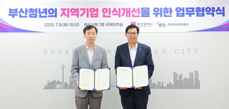 캠코는 8일 부산시청에서 부산시와 '부산 청년의 지역기업 인식개선을 위한 업무협약'을 체결했다. 이번 협약은 부산소재 기업에 대한 긍정적 인식을 확산하고 지역청년의 취업역량을 강화해 지역기업의 청년고용 활성화를 유도하기 위해 마련됐다.