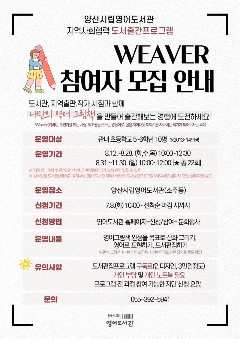 [양산=뉴시스] 안지율 기자 = 경남 양산시립영어도서관은 8월부터 11월까지 운영되는 지역사회 협력 도서출간 프로그램 'WEAVER' 참여자를 모집한다.