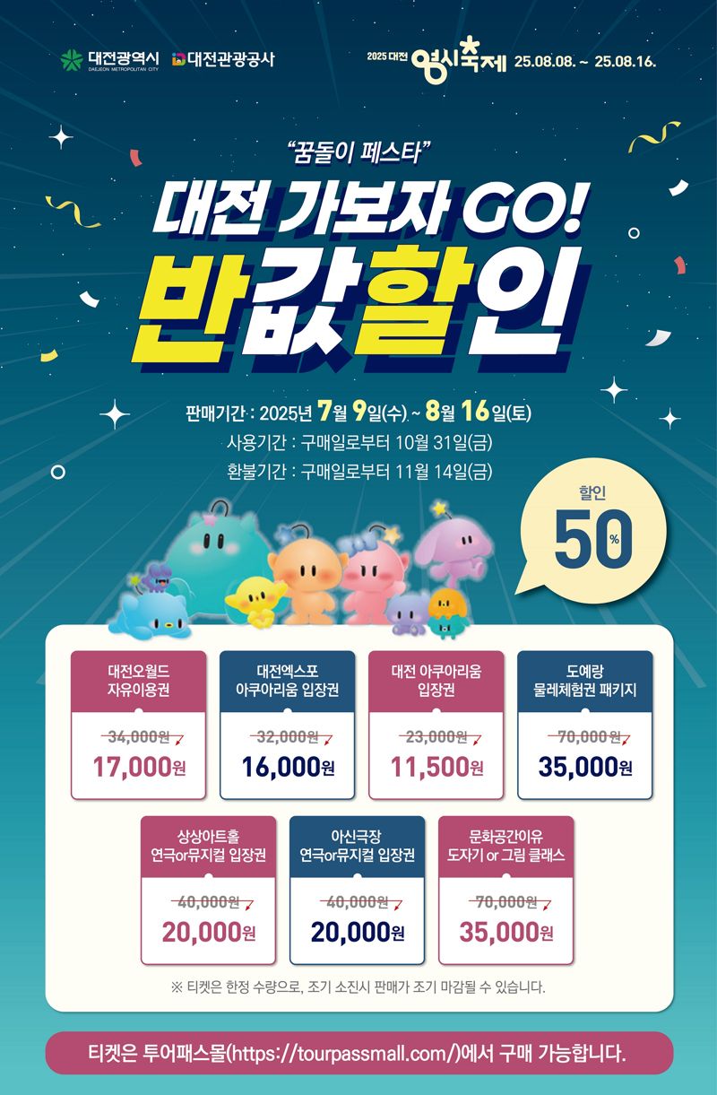 대전시는 대전관광공사와 함께 이달 9일부터 ‘대전 가보자 GO! 반값 할인’ 프로모션을 시작한다고 밝혔다. 이번 행사는 다음달 8일부터 16일까지 열리는 ‘대전 0시 축제’에 앞서 대전의 주요 관광지와 체험시설을 반값에 즐길 수 있는 기회를 제공한다.