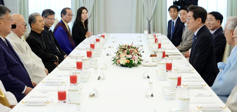 [서울=뉴시스]조재완 김경록 기자 = 이재명 대통령은 9일 불교와 기독교를 비롯한 7대 종교 지도자들을 만나 "각별한 관심으로 우리 사회가 서로 존중하고 화합하고 손 잡고 함께 가는 합리적이고 더 포용적인 세상이 될 수 있게 큰 역할을 기대한다"고 요청했다.