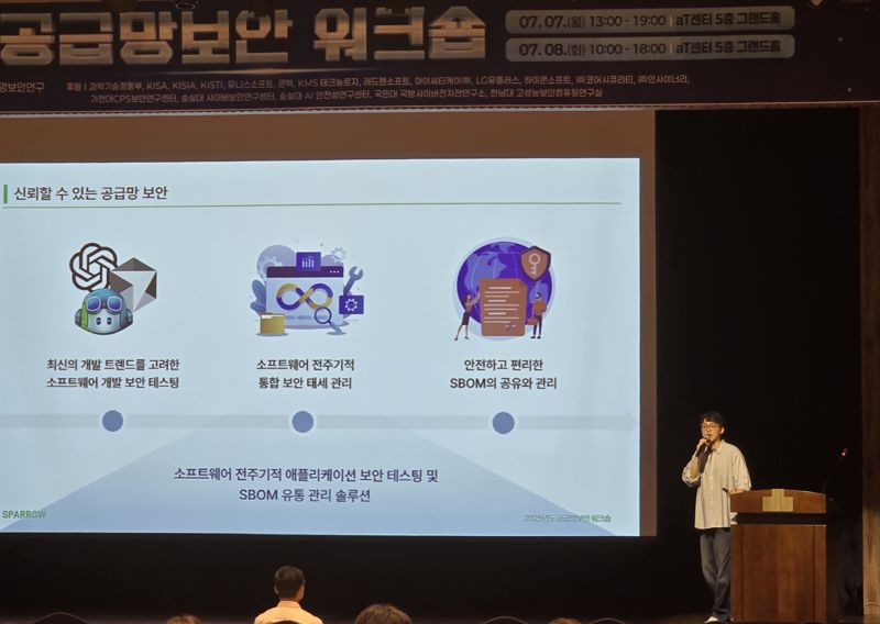 스패로우가 지난 7~8일 서울 서초구 AT센터에서 열린 ‘2025년도 공급망보안 워크숍’에 참여해 신뢰할 수 있는 소프트웨어(SW) 공급망 형성 방안을 발표했다고 9일 밝혔다.