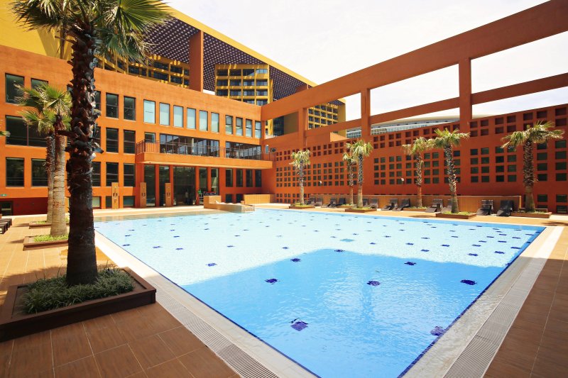 제주부영호텔&리조트의 야외수영장은 해외 럭셔리 호텔을 연상케 하는 오렌지색 건물과 야자수가 어우러진 이국적인 풍경으로 입소문을 타고 있다.